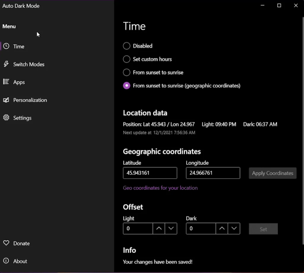 Puoi impostare orari personalizzati che attiveranno il cambio del tema di Windows 11, puoi impostare l’app per passare alla modalità oscura dal tramonto all’alba utilizzando le impostazioni della posizione da Windows 11 oppure puoi impostare l’app per passare alla modalità oscura dal tramonto all’alba (coordinate geografiche) .