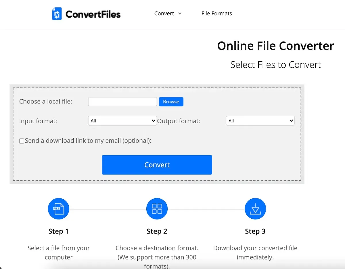 ConvertFiles è un’altra opzione semplice che copre una varietà di formati di file di input e output. Cerca il tuo file o inserisci il suo URL per iniziare. Seleziona i formati dai tipi di documenti, disegni, presentazioni, ebook, video, immagini, archivi o audio.