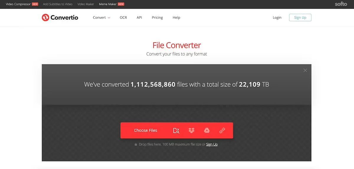 Per convertire rapidamente i file dal tuo computer, Dropbox, Google Drive o un URL, dai un’occhiata a Convertio. Carica il tuo file e poi scegli il tipo di conversione da immagine, documento, ebook, presentazione o formato vettoriale.