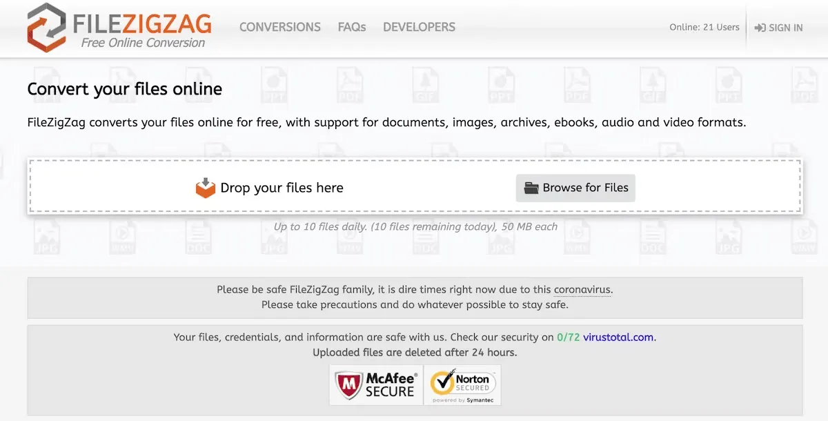 FileZigZag è un convertitore di file online gratuito basato su email, simile a Zamzar. Supporta anche formati di file documenti, audio, immagini, video e archivi.