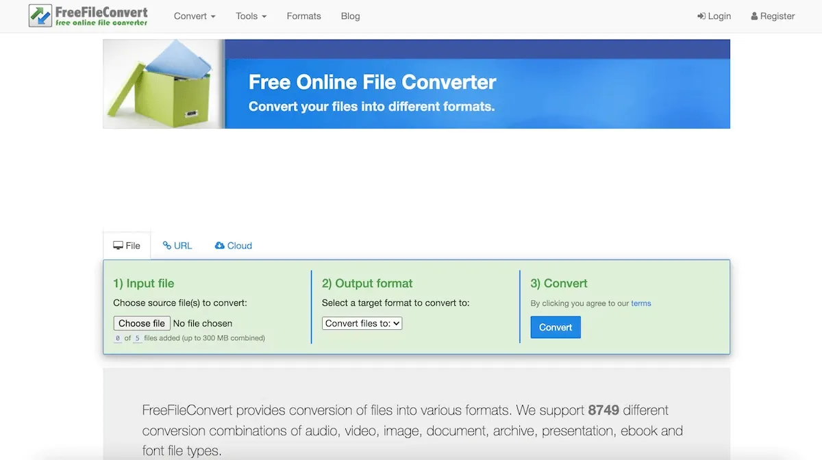 FreeFileConvert supporta una sorprendente combinazione di 8.700 conversioni. Quindi, se ne hai una insolita, questo è il sito da visitare. Puoi aggiungere fino a cinque file da convertire contemporaneamente, ma nota che devono essere dello stesso tipo di file.