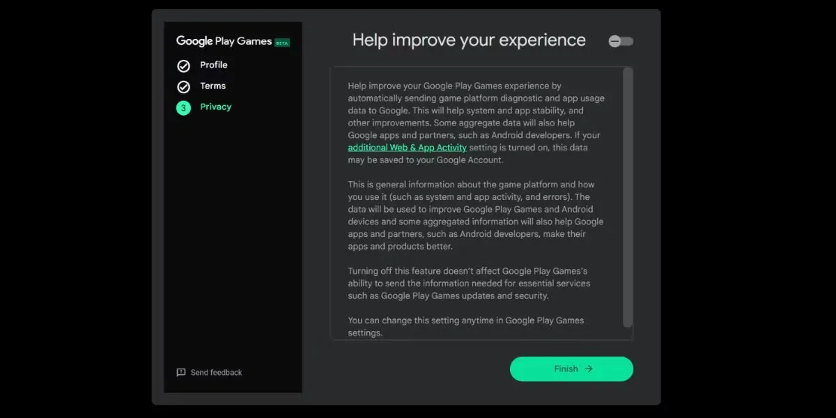 - Disattiva l’interruttore “Aiuta a migliorare la tua esperienza” e fai clic su Fine.