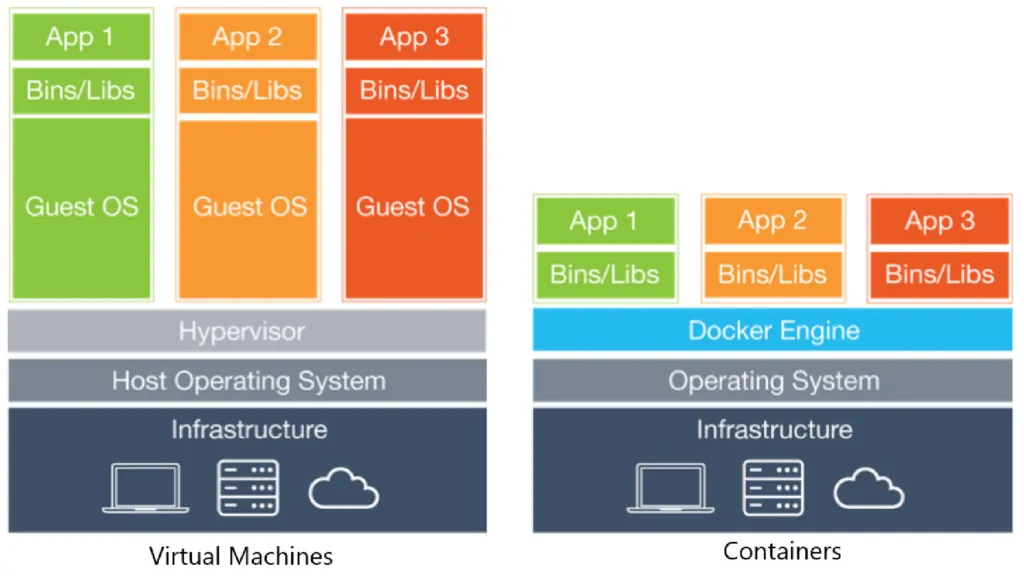 Un diagramma a strati che mostra la differenza tra “Virtual Machines” (con Guest OS pesante) e “Containers” (che condividono il kernel dell’host tramite il Docker Engine).