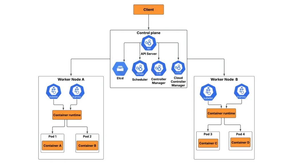 Uno schema architetturale di un Cluster Kubernetes. Al centro il “Control Plane” (il cervello) che gestisce diversi “Worker Nodes”, all’interno dei quali si vedono molteplici icone di Docker/Container raggruppate in “Pod”.
