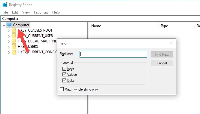 2. Una volta aperto l’Editor del Registro di sistema, selezionare “Computer” nel pannello di sinistra. Quindi, premi Ctrl+ Fscorciatoia da tastiera per aprire lo strumento Trova. Puoi anche selezionare “Modifica → Trova”.