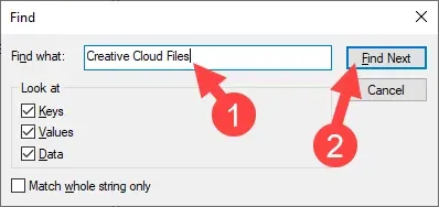 3. Nella finestra Trova, digita “File Creative Cloud” e fai clic sul pulsante “Trova successivo”.