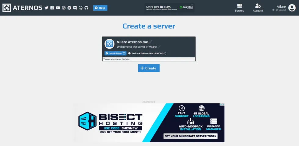 Dopo esserti registrato o aver effettuato l’accesso, verrai portato al pannello del tuo account dove potrai creare un server. Ci sarà un pulsante verde che dice “Crea” nella homepage, che devi premere. Verrà visualizzato un profilo del server e un altro pulsante blu che dice “Crea”. Premi entrambi per avviare il tuo nuovo server.
