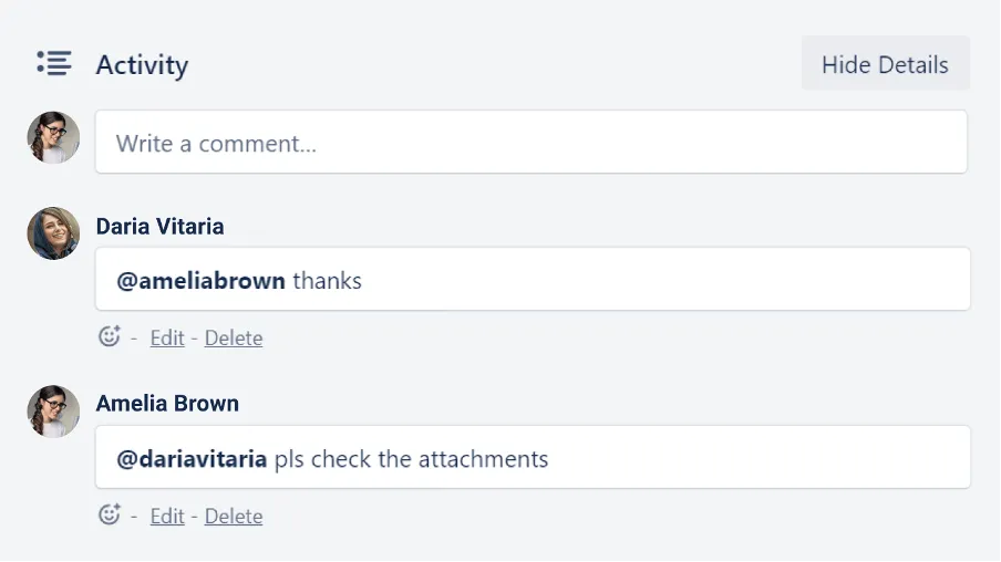 I commenti aiuteranno a migliorare la comunicazione nel team. Lasciare feedback, fare domande, discussioni direttamente nelle schede delle attività, così tutti rimangono nel contesto, e mentre si effettua un commento e possibile vedere la scheda inerente.