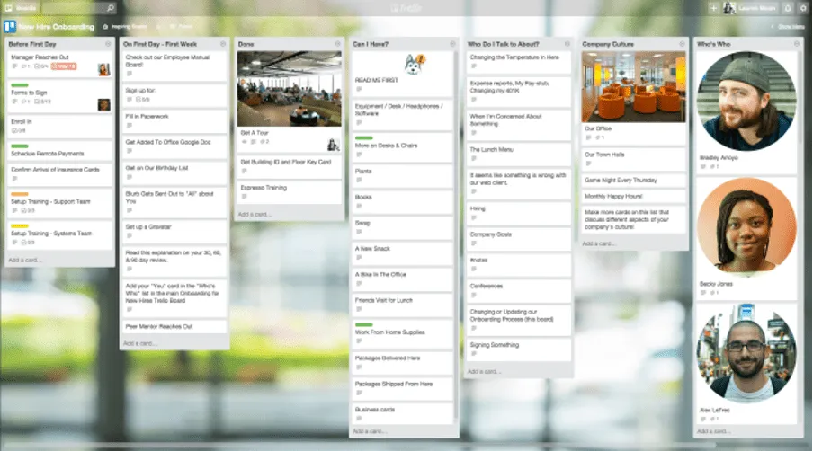 I primi due elenchi contengono attività che le risorse umane e i nuovi dipendenti devono completare prima e dal primo giorno alla prima settimana. Puoi creare liste di controllo per ogni attività, come 401k, tasse scartoffie, logistica e molto altro. È possibile anche aggiungere un elenco ci cultura aziendale. Inoltre, contiene un elenco delle risorse e delle persone, in modo che i dipendenti sappiano a chi rivolgersi in caso di problemi.