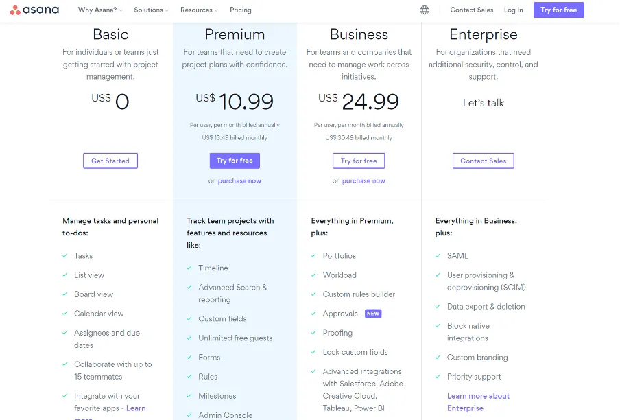Asana ha caratteristiche paragonabili a Trello quando si tratta dell’approccio Kanban-board alla gestione delle attività. Include anche funzionalità di automazione del flusso di lavoro più avanzate e tre diverse visualizzazioni.