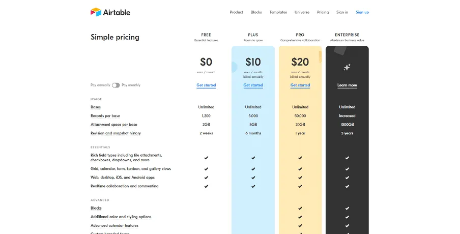 Il piano gratuito include 1200 righe e 5 GB di spazio di archiviazione. Plus parte da $10 per utente al mese.