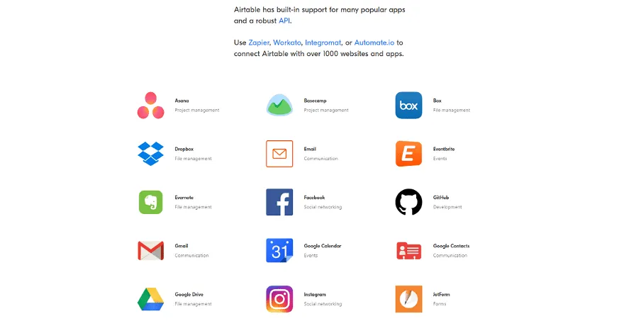 Airtable ha 32 integrazioni native tramite la sua API, ma ne supporta oltre 1000 in più tramite Zapier e altre soluzioni SaaS di integrazione.
