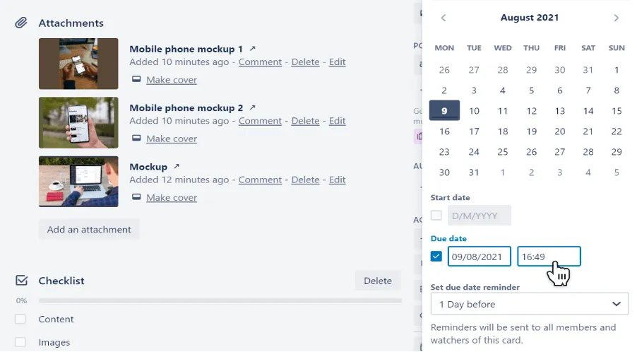 Quando si gestisce un progetto, le scadenze sono importanti. Quindi Trello consente di aggiungere data di inizio e fine alle card, cos’ è possibile visionare la scadenza.