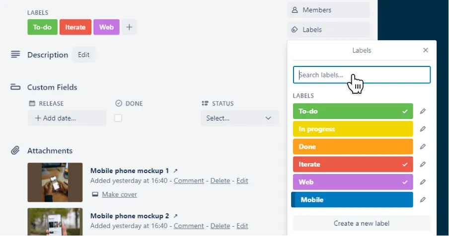 Per tenere traccia del cambiamento di stato ci sono le etichette. È possibile applicare determinate etichette correlate a diversi stati alle card, quindi persino a filtrare le card per etichette per vedere solo attività con determinati stati.